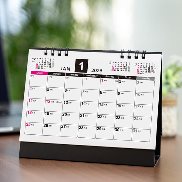 シックなカラーと書き込みやすいデザインの卓上カレンダー。前月と2ヶ月先までの4ヶ月分を一覧でき機能的です。