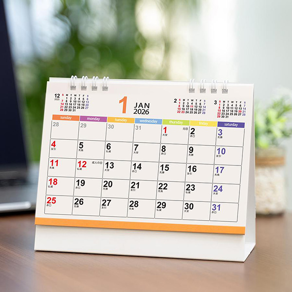 パステルカラーのやさしい風合いと書き込みやすいデザインの卓上カレンダー。前月と2ヶ月先までの4ヶ月分を一覧でき機能的です。